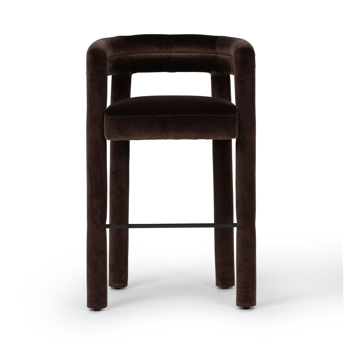 Tubular shaping lends a fluid look to this fully upholstered dining style of soft, velvety cotton. Perfectly sized for the bar, a metal stretcher makes for a comfortable sit.